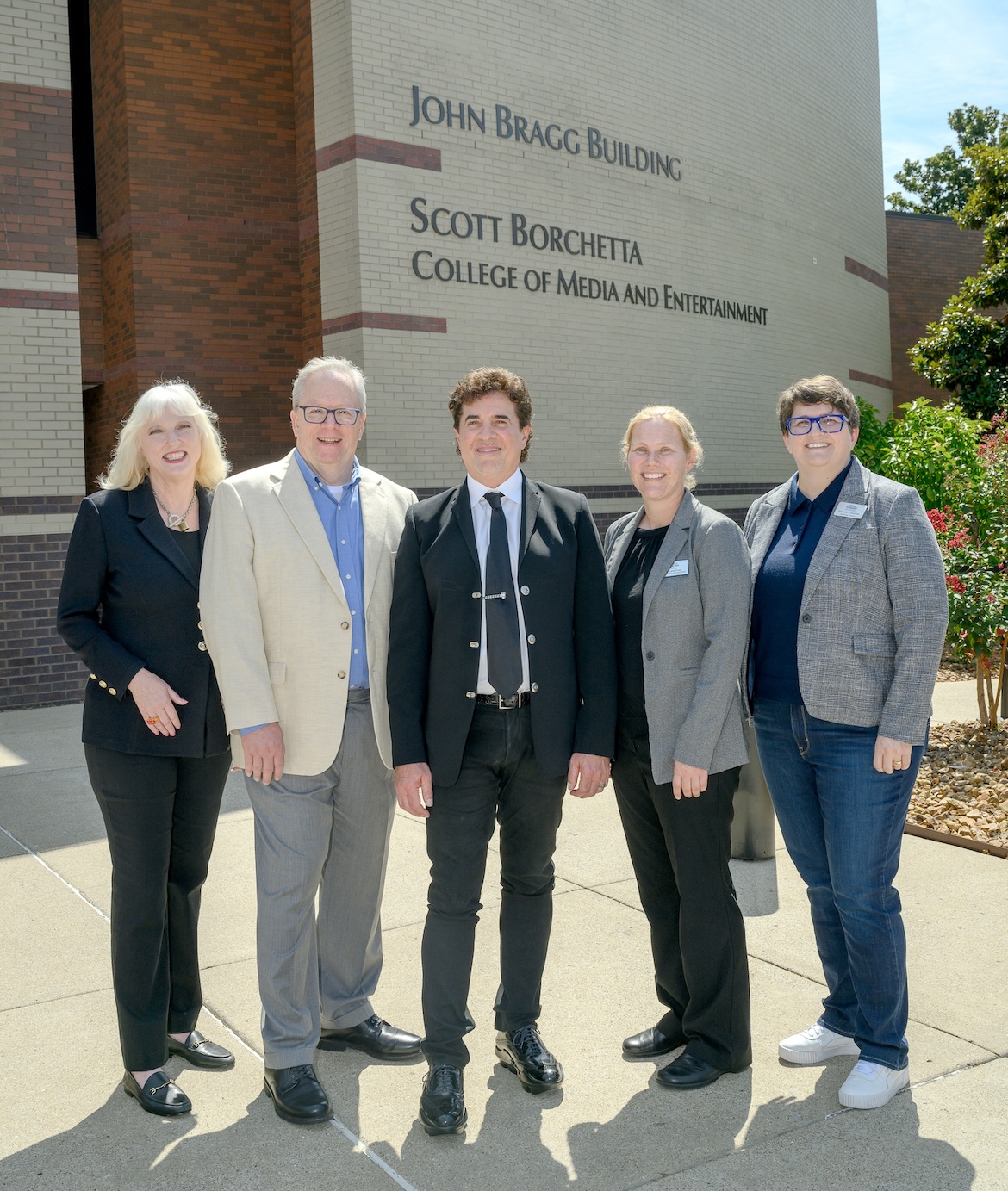 Borchetta (center) with Dean Keel (l) and department chairs Robert Gordon, Media Arts; Katie Foss, Journalism and Strategic Media; and Michelle Conceison (r), Recording Industry (MTSU photo by J. Intintoli)