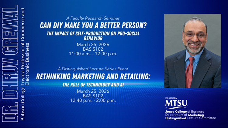 MURFREESBORO, Tenn. — Middle Tennessee State University welcomes Dhruv Grewal, Toyota Chair in Commerce and Electronic Business and Professor of Marketing at Babson College in Massachusetts, to the Jennings A. Jones College of Business on Wednesday, March 25, for a series of lectures to the campus community.