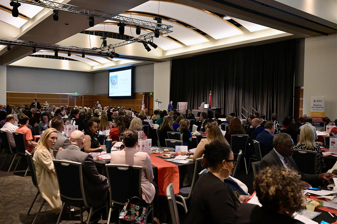 Around 400 Red Cross patrons packed the Student Union Ballroom, where Heart of Tennessee Chapter Board Chair Ginny Williams and Vice Chair Robert Coggin presented a year in review highlighting the results of nearly 29,000 volunteer hours and 14,588 units of blood donated.