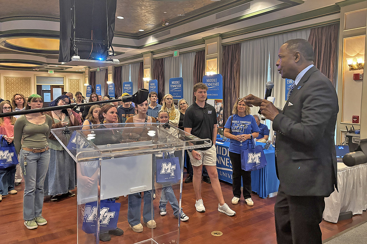 “Quality academic programs, truly caring faculty, affordable and an absolutely beautiful campus,” MTSU president Sidney A. McPhee said during the Knoxville student reception that drew dozens of prospects Thursday, Oct. 16, at Bridgewater Place, with a similar message to a smaller group of students and parents Wednesday, Oct. 15, at The Carnegie Hotel in Johnson City.