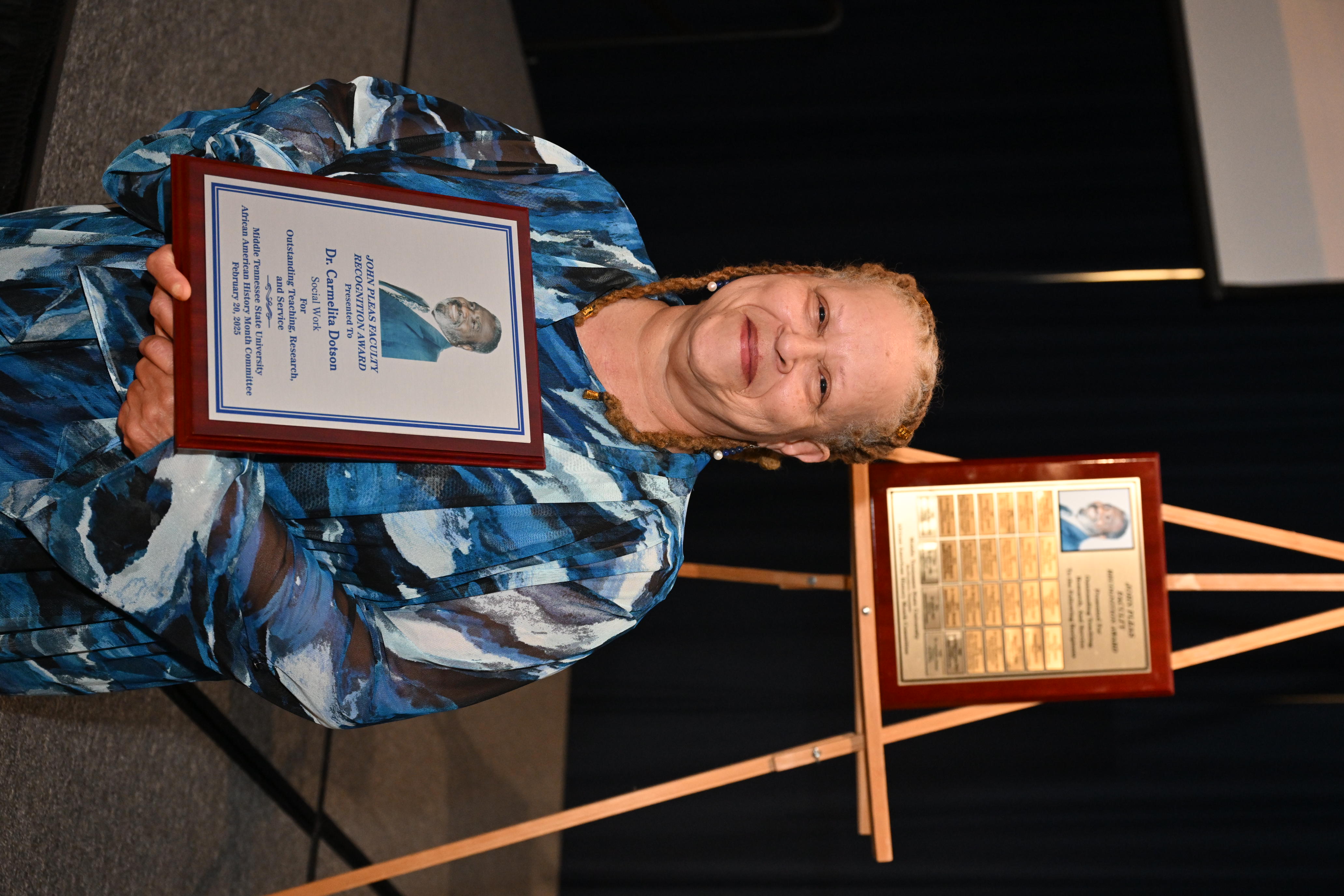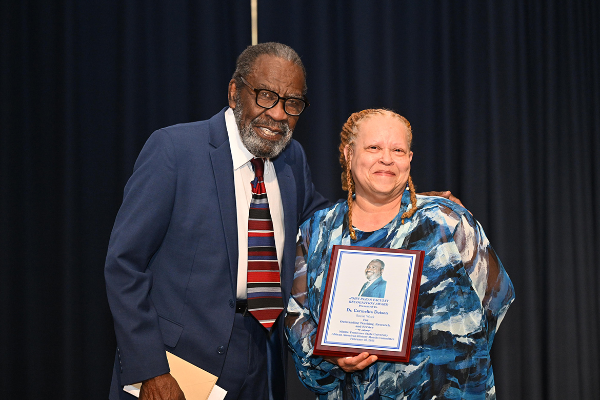 MURFREESBORO, Tenn. — Amazing, phenomenal, invaluable, creative — all words used to describe Middle Tennessee State University assistant professor and Bachelor of Social Work program coordinator Carmelita Dotson, who was honored Thursday, March 27, as recipient of the 2025 John Pleas Faculty Award.