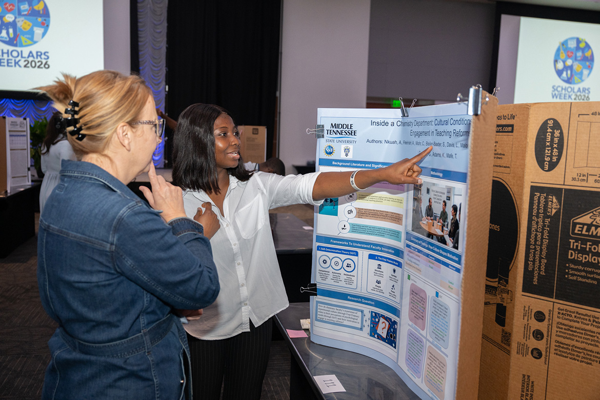 “Scholars Week is the space where months or even years of research are showcased. It is indicative of a positive and advancing research culture at MTSU,” she said. “The success of organizing Scholars Week 2026 has truly been a team effort. I could not have asked for a better group to work with.”