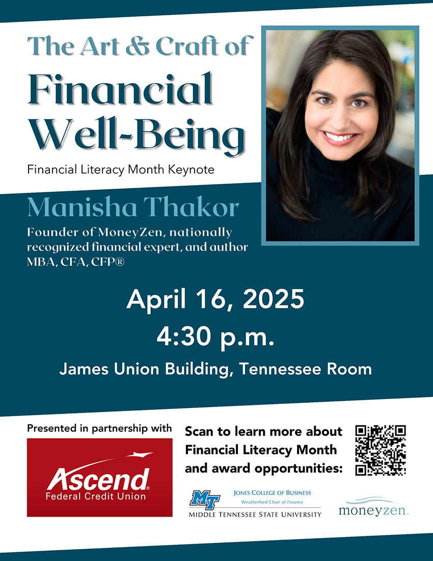 MURFREESBORO, Tenn. — Middle Tennessee State University invites students and the general public to hear the financial wisdom of “MoneyZen” author, consultant and financial planner Manisha Thakor on Wednesday, April 16, for her keynote remarks for this year’s Financial Literacy Month observance.